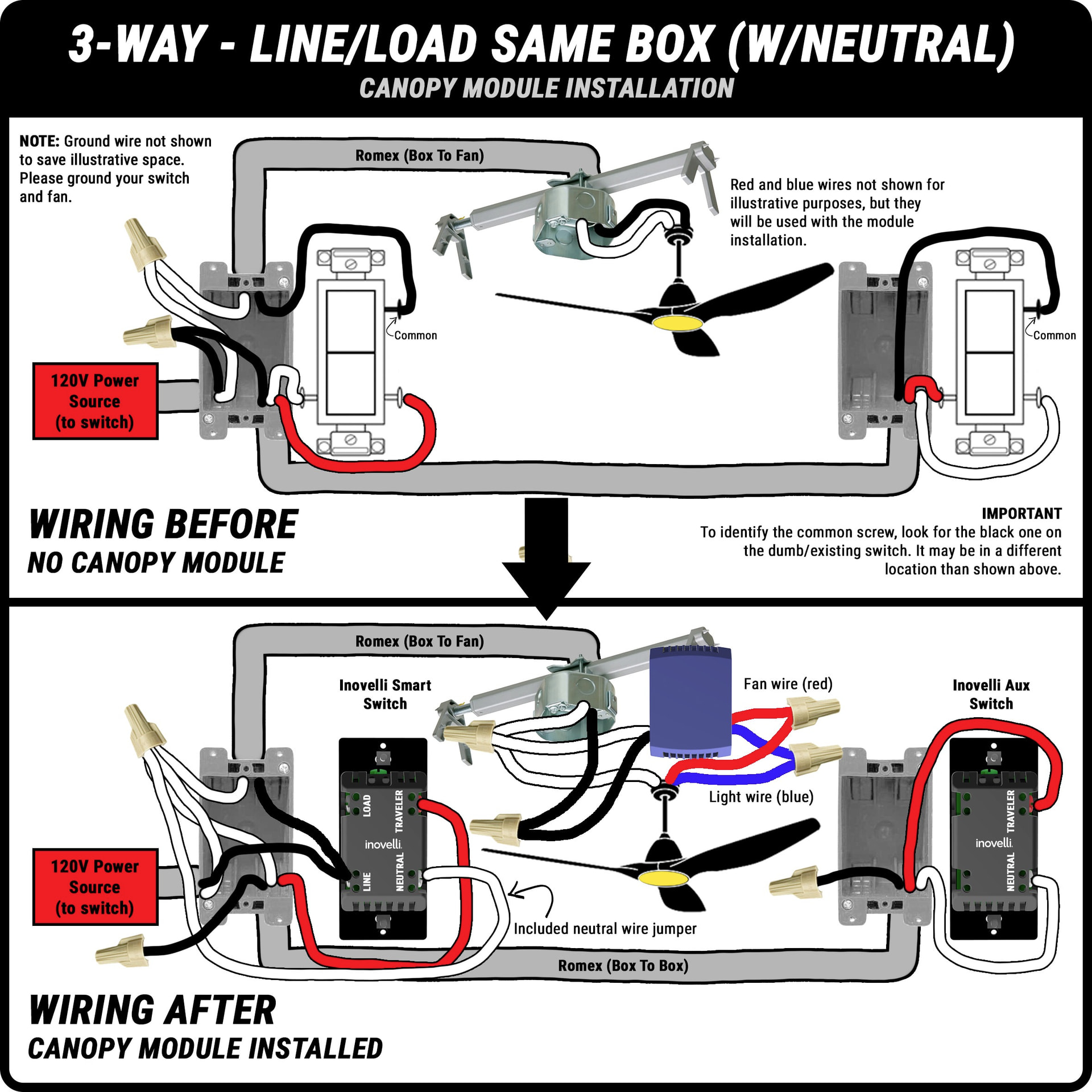 If you wanted to be able to connect the Load to the Load connection on the switch so you can use the air gap pull out tab, you would need to go with an On/Off switch, as it will still work the same as the Dimmer when binding to the Canopy module (or through automations), with the additional capability of being rated for for both motors and lighting loads… but you’d still need an Aux switch.