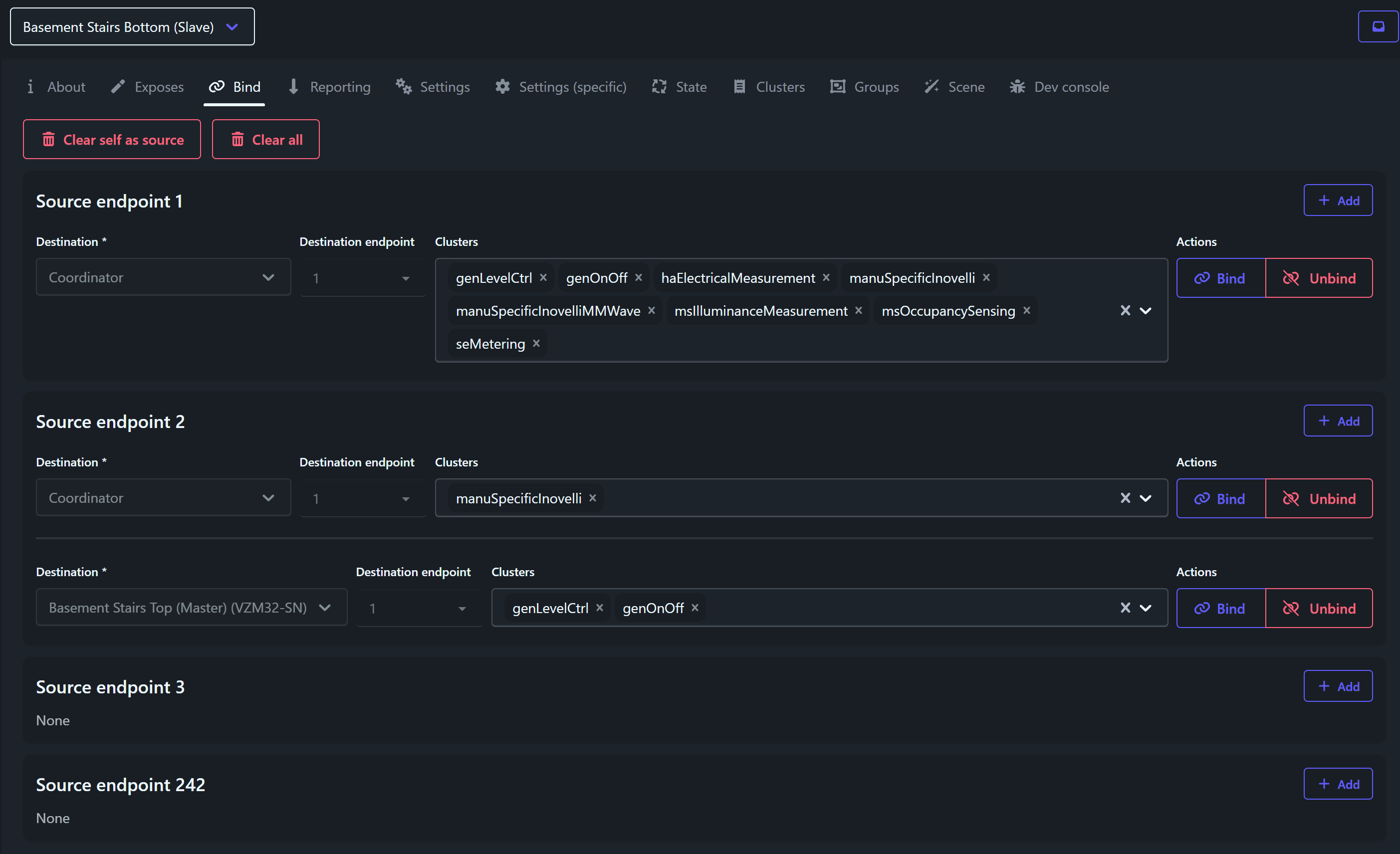 But with the individual bindings, this wasn’t a problem anymore. We could unplug the coordinator and everything still worked as expected. We also noticed that the latency between pressing on/off and the light actually changing was significantly improved by direct bindings.