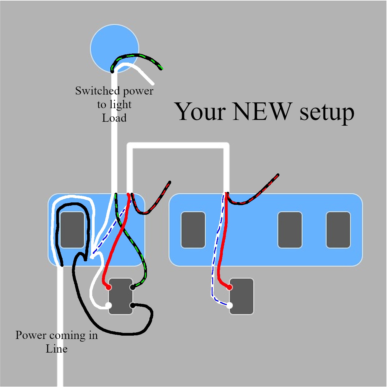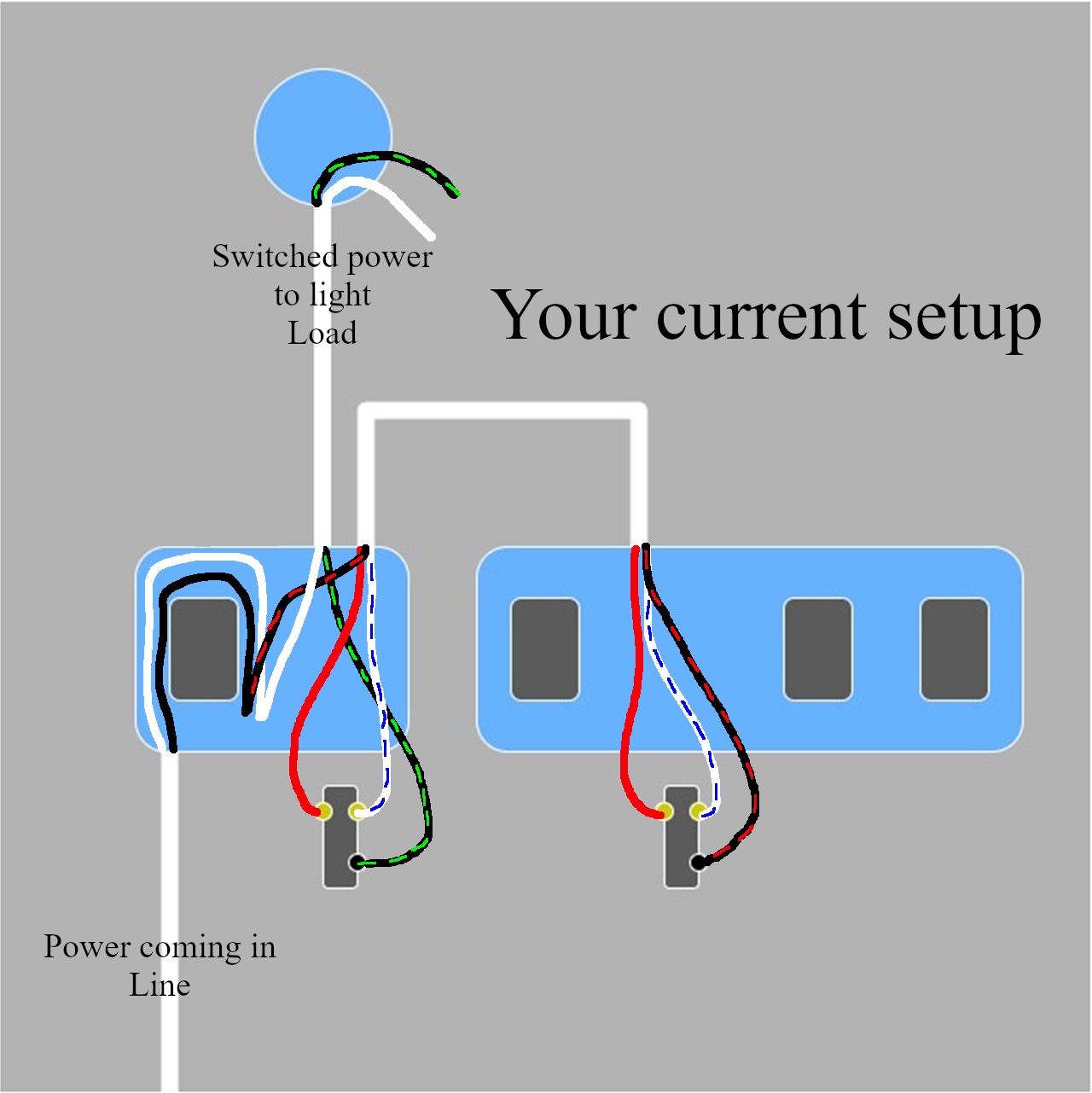Here you go, hopefully this makes things clearer… provided you with both how it/was is currently wired as well as what you need to change it to. I did not include all of the extra wiring, only the wiring specific to your switches.