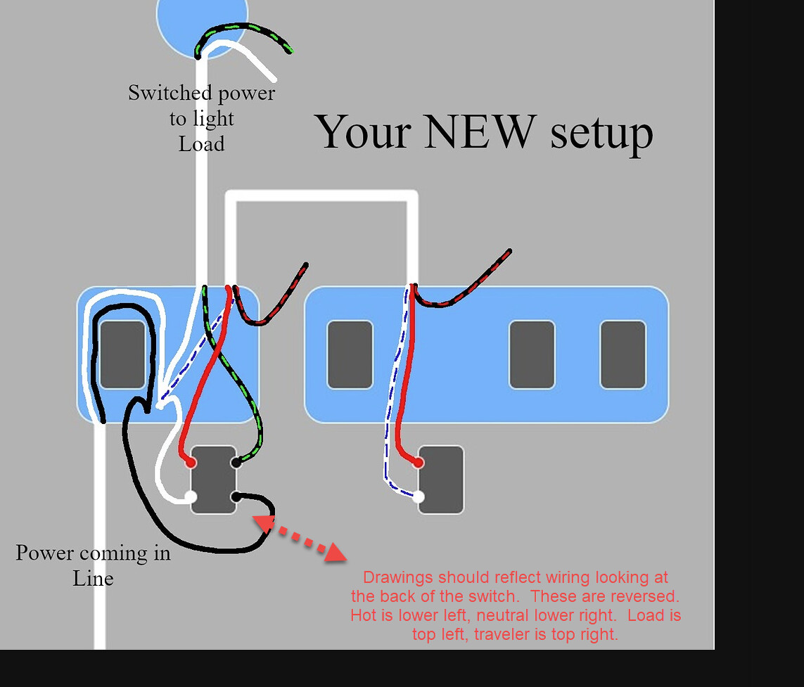 Drawings should always reflect looking at the BACK of the switch to avoid confusion. In the NEW setup drawing above, the connections are reversed, drawn as if you are looking at the front of the switch.