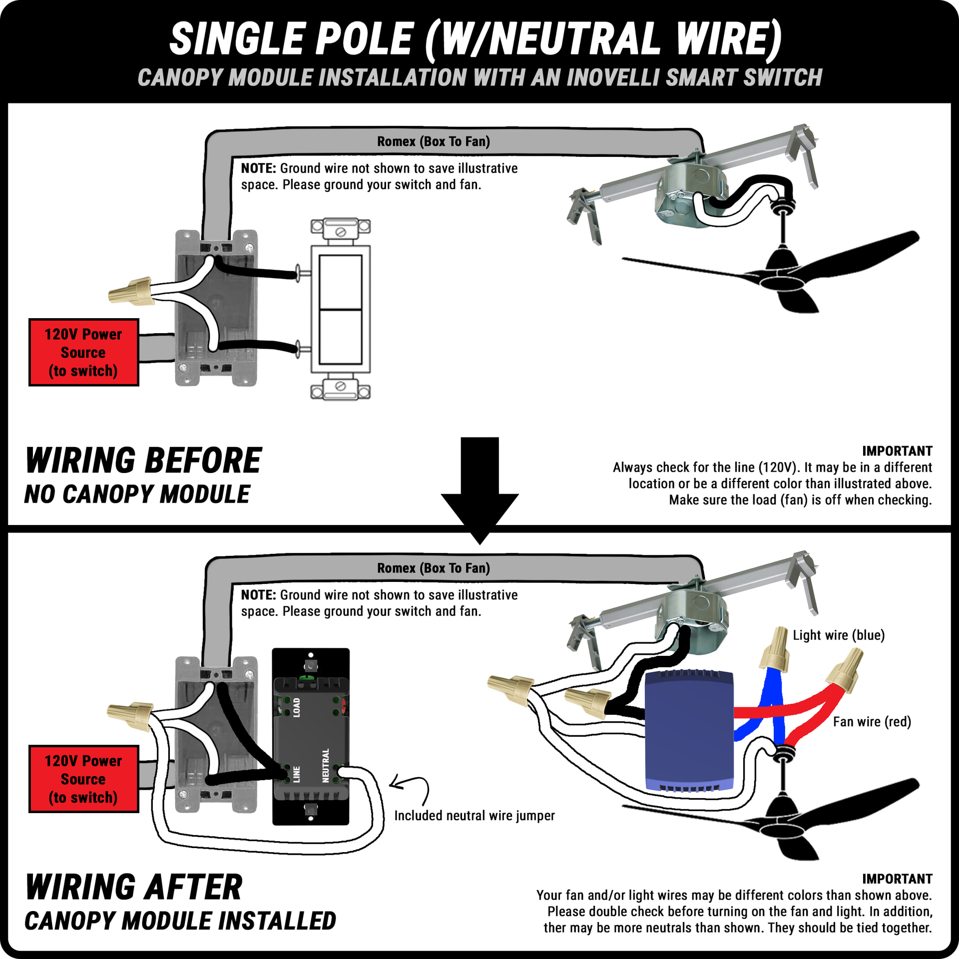 If the canopy is properly paired with the hub and you send hub commands to the canopy but the fan or light isn’t responding, that would suggest improper canopy wiring. So get the canopy part working first and then focus upon the switch.