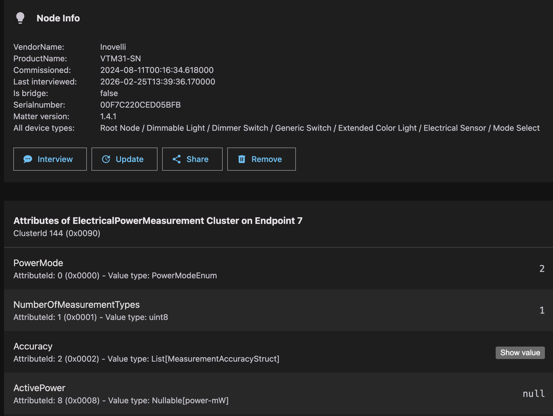 Possibly a long-shot, but … could it be a Home Assistant issue? If you haven’t already checked it, then I suggest you go to the Matter Server app’s web interface, find the node, and check the Electrical Sensor endpoint (7), and look at the PowerMeasurement Cluster, ActivePower attribute and ElectricalEnergyMeasurement cluster, CumulativeEnergyImported attributes to see if they are null, or if they have a value.
