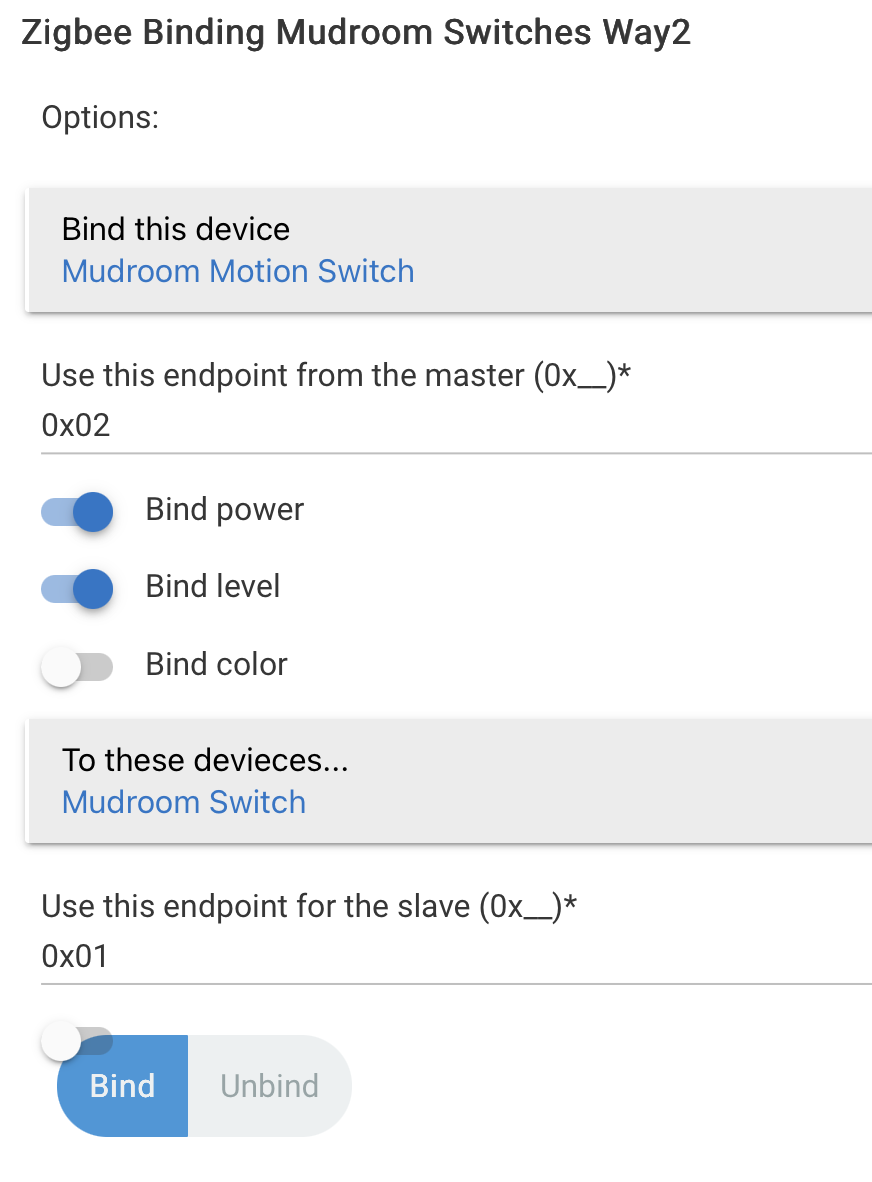 Thanks for that tip. I’m new to Zigbee binding, so if I create this group, do I need to unbind the devices somehow before binding them to the group? Or do I still need the devices bound together so they act as a thruway (meaning the group binding is just for state). And (last thing I hope), would the group binding keep the LEDs in sync as well?