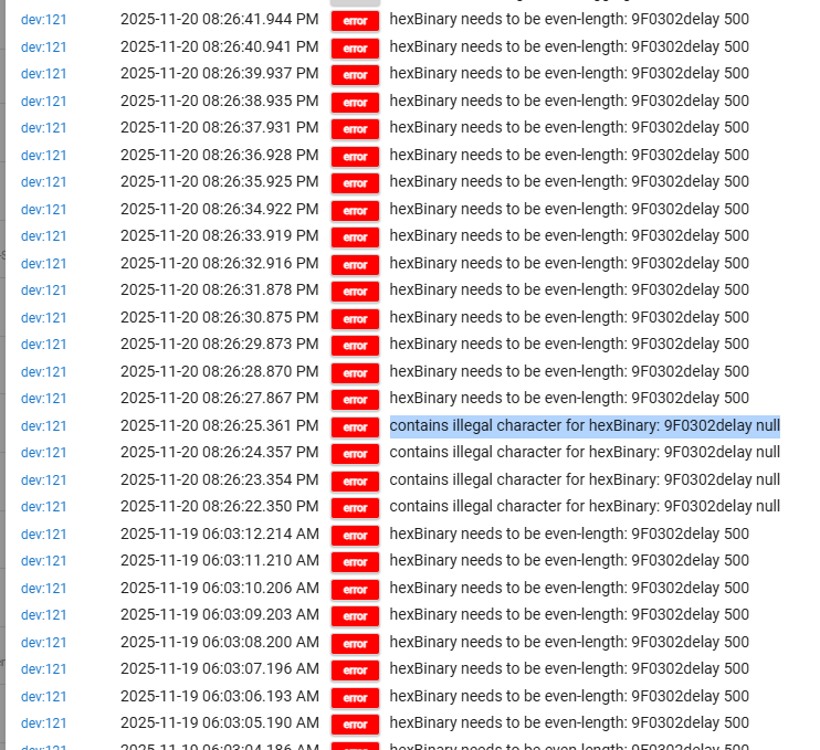 Linking in an old thread where I have the same issue. Device works fine- i’m on firmware ver 1.02, with the most recent driver vzw31-sn released on 2025-11-20. Hubitat shows errors for “hexBinary needs to be even-length: 9F0302delay 500” and sometimes error “contains illegal character for hexBinary: 9F0302delay null”