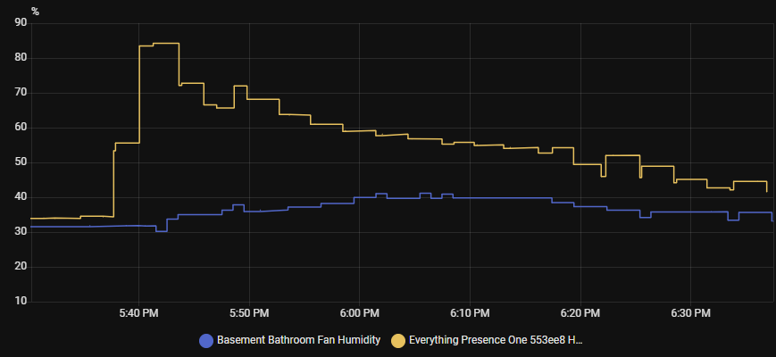 In one of the bathrooms, my previous set up was using an Everything Presence One that would trigger a light switch for occupancy and trigger the fan switch when the relative humidity raised above 60% to exhaust some of the moist air.