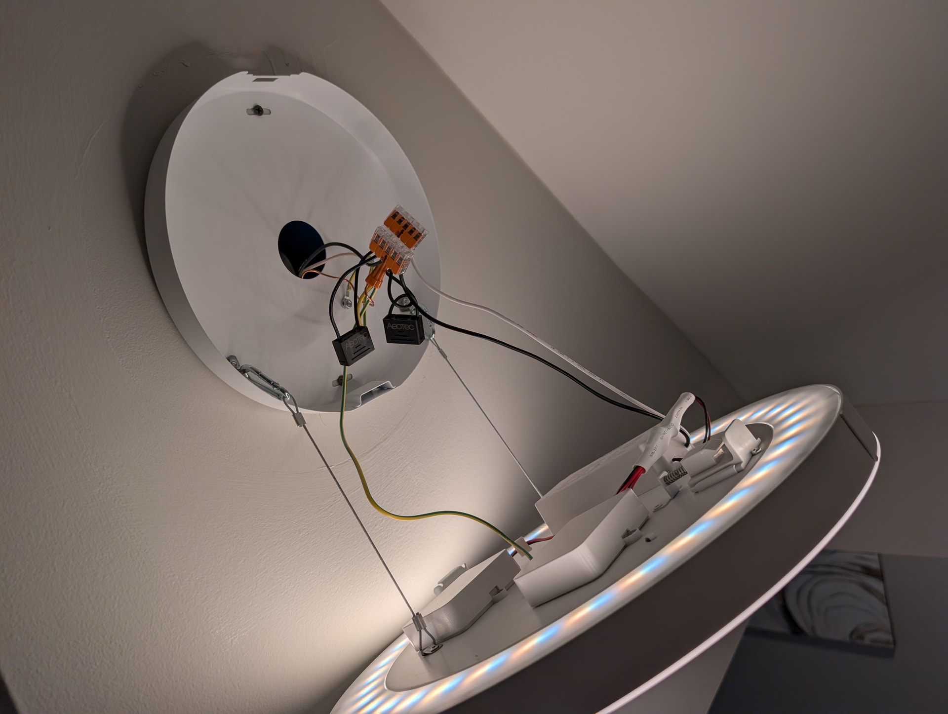 The only downside to this is that the bulb is powered unswitched, so you have to throw the breaker to cut power to it. However, you could also add a smart relay in the lightbox to cut power so that you don’t have to do that.
