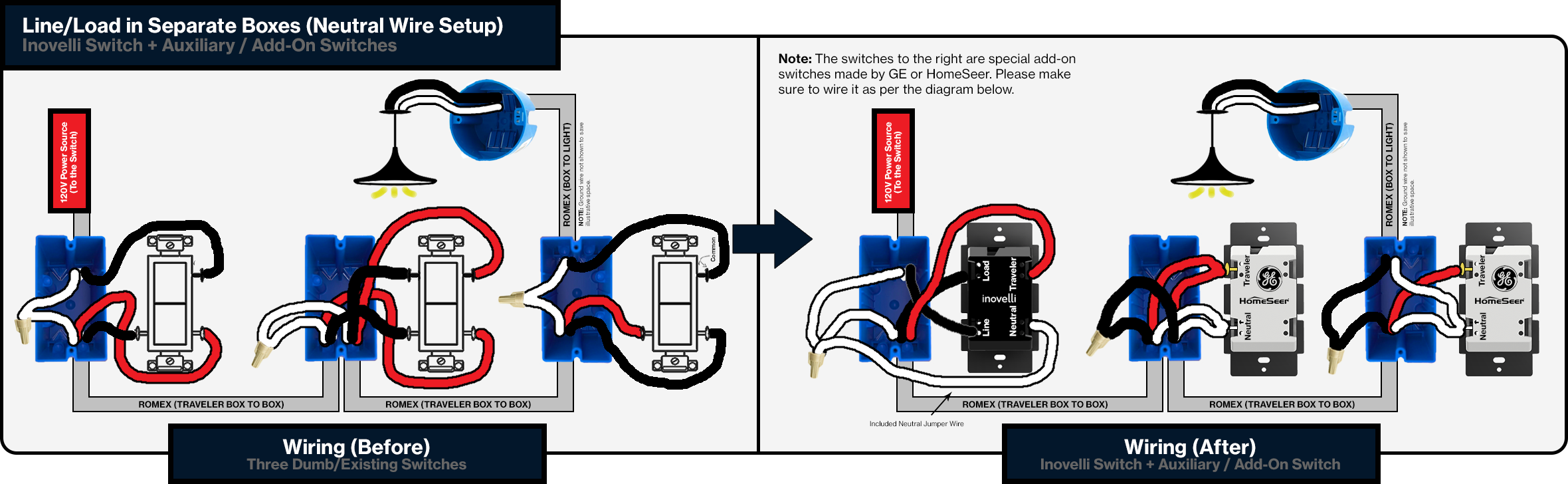 However, some of the schematics show the aux switch as Made by GE or HomeSeer (no mention of Inovelli). Does this mean that the Inoveli Aux switch won’t work in these configurations?