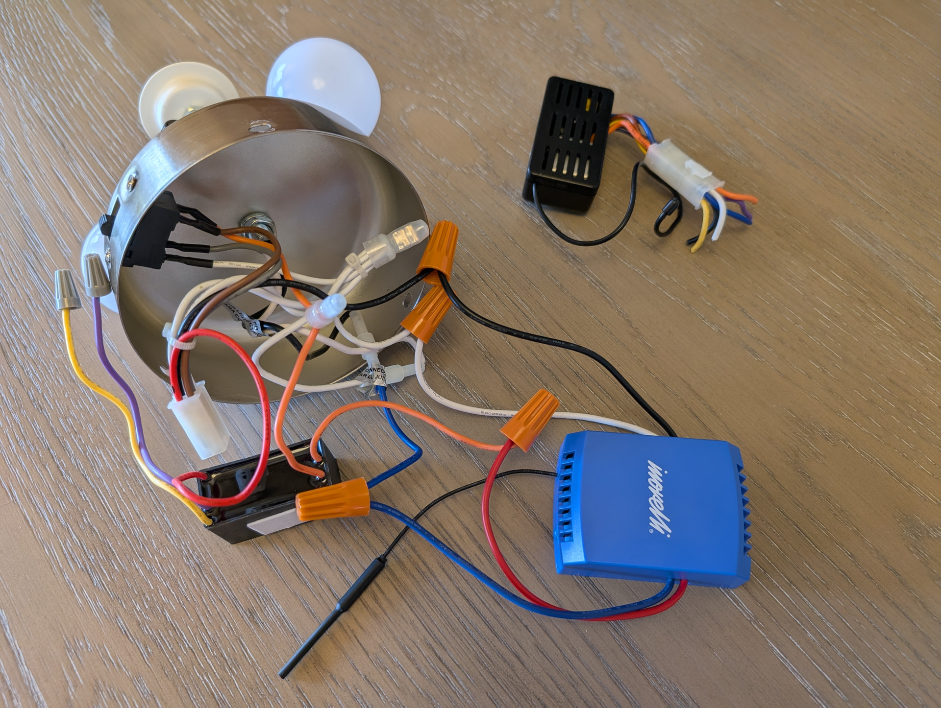 Orange1 wire coming from reverse switch into capacitor and out to orange2 wire (goes to the wireless remote module, changes wire color to gray) and connects to FAN HI.