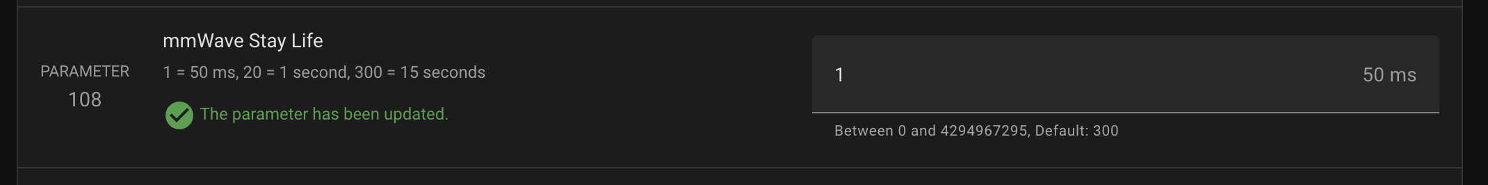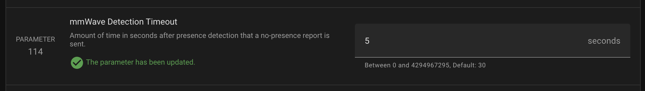 - Detection Timeout (param 114): If the switch sees large movement that goes out of detection range, like if a person walks out of the room, how long should the switch report “Presence Detected”?