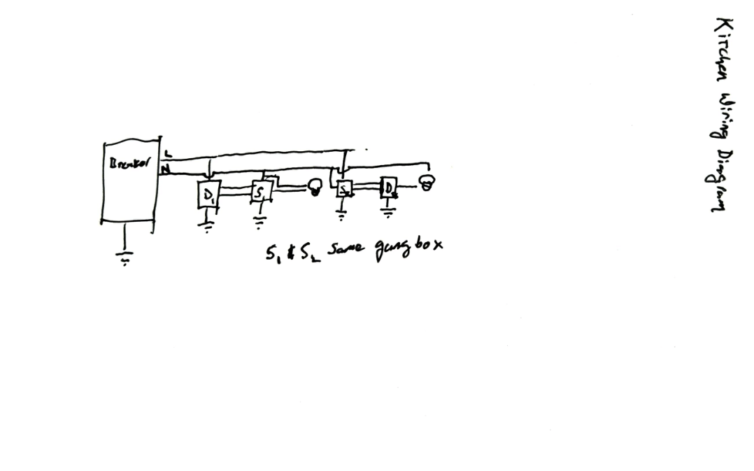 Additionally, the load side of the entrance circuit is in the same gang box as the line side of my TV lights. The line side of the TV lights is tied to the kitchen circuit breaker. This circuit is also omitted from the diagram.