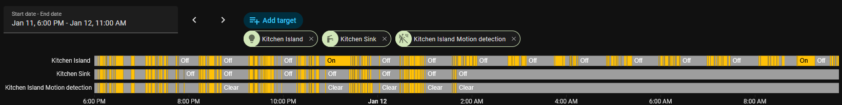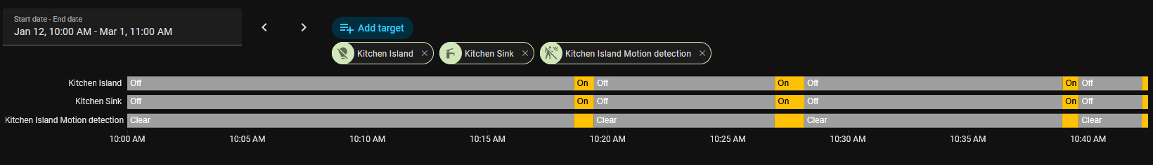 Here is the history. The Kitchen Island (mmwave sensor) is associated and controls the Kitchen sink (inovelli dimmer). After constantly turning on/off, the association bugs out and stops turning on/off the kitchen sink seemingly following the motion detection. However the island light keeps turning on and off probably due to the mmwave sensor still working.