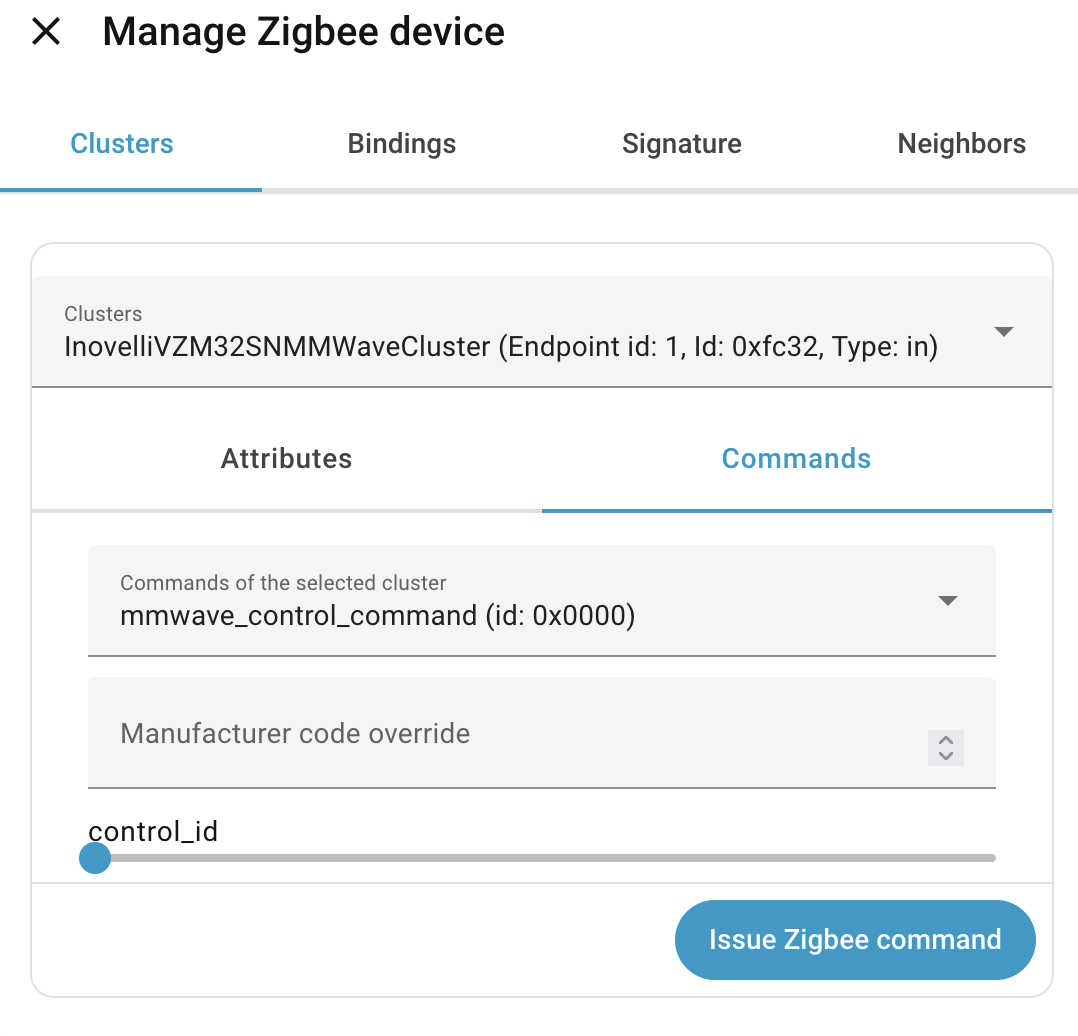 Does anyone have instructions for how to issue the set interference area command with ZHA? If I go to the zigbee device, this is the screen I’m looking at – I’ve tried issuing a manufacturer override of 111 and a control ID of 1; I’ve also tried leaving manufacturer override blank and just doing control ID 1. Both of these seem to do something (switch blinks), but they don’t show LEDs glowing amber and don’t seem to fix my washing machine triggering the switch.