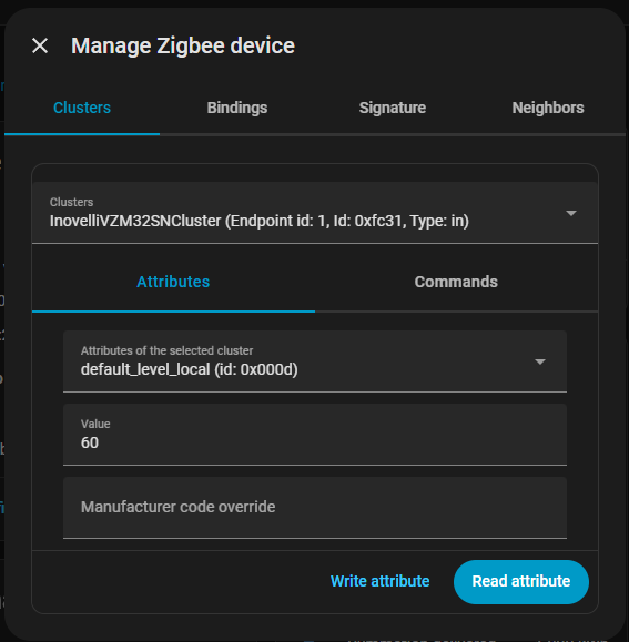 I want to set up a pretty simply automation that changes the default dimmer level to about 20% at night, and back to 100% in the day. But I cannot get HA to actually access and set the default dimmer level on the dimmer switch. I can set it manually by managing the zigbee device and finding the correct attribute and writing a new value, but I can’t find any way to write to this attribute with automations.