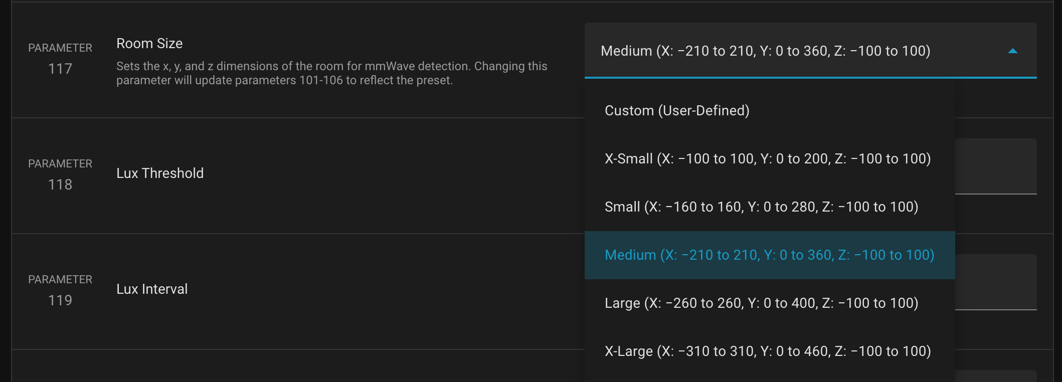 I’ve done a little more investigative work. I’ve continued to find that changes to P101 - P106 do nothing for me. However, there’s P117: Room Size. It’s a dropdown list with predefined dimensions. Per the parameter description: “Sets the x, y, and z dimensions of the room for mmWave detection. Changing this parameter will update parameters 101-106 to reflect the preset.”