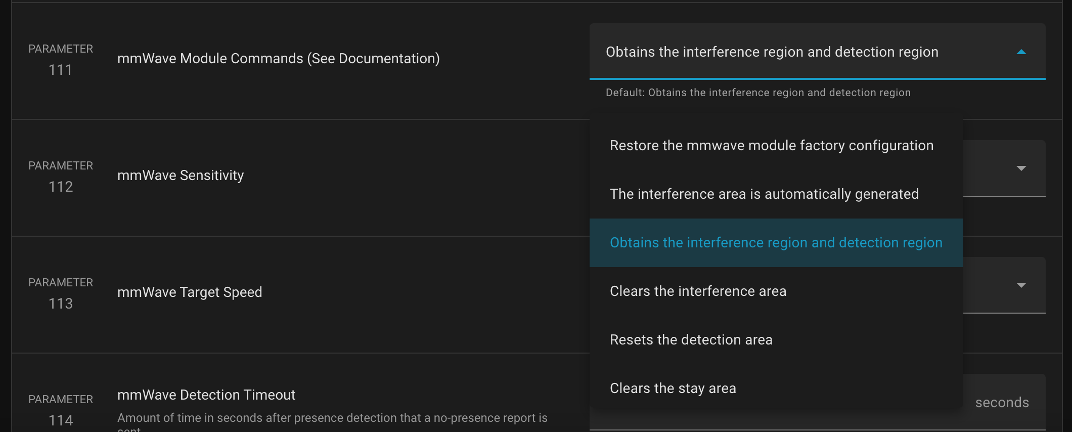 It’s currently set to “Obtains the interference region and detection region”, which is the default. The documentation doesn’t even define what “interference”, “detection”, or “stay area” mean. I just don’t know how to use these commands.