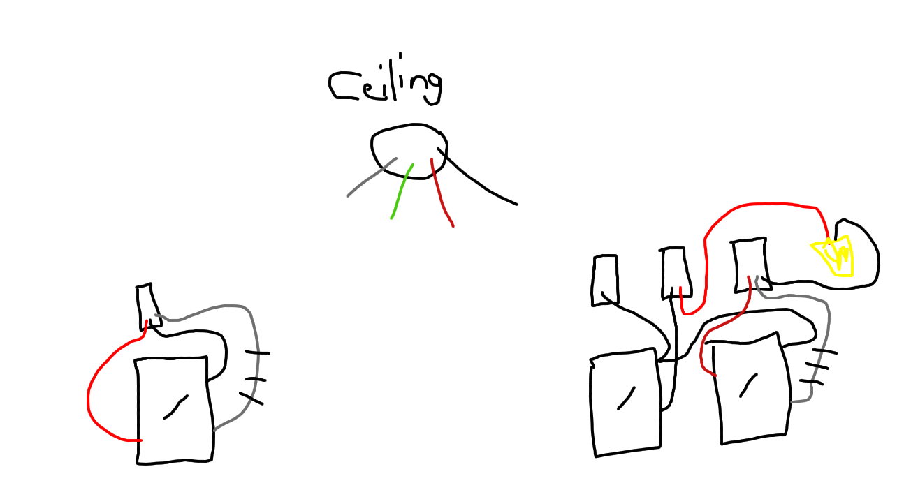 However, with the remote switch on and both switches in the double box off there is no power at all to the ceiling box. But the moment I toggle any one of the 3 switches on I’m getting live on both the black and red in the ceiling box. I have a rough diagram drawn. Someone please help me understand what is going on here. This is a new-ish house. Maybe 20 years old. I could of course disconnect everything, cut the breaker and pull out the multimeter to trace everything, but my hope is that it is just some odd configuration that is known, but unknown to me.