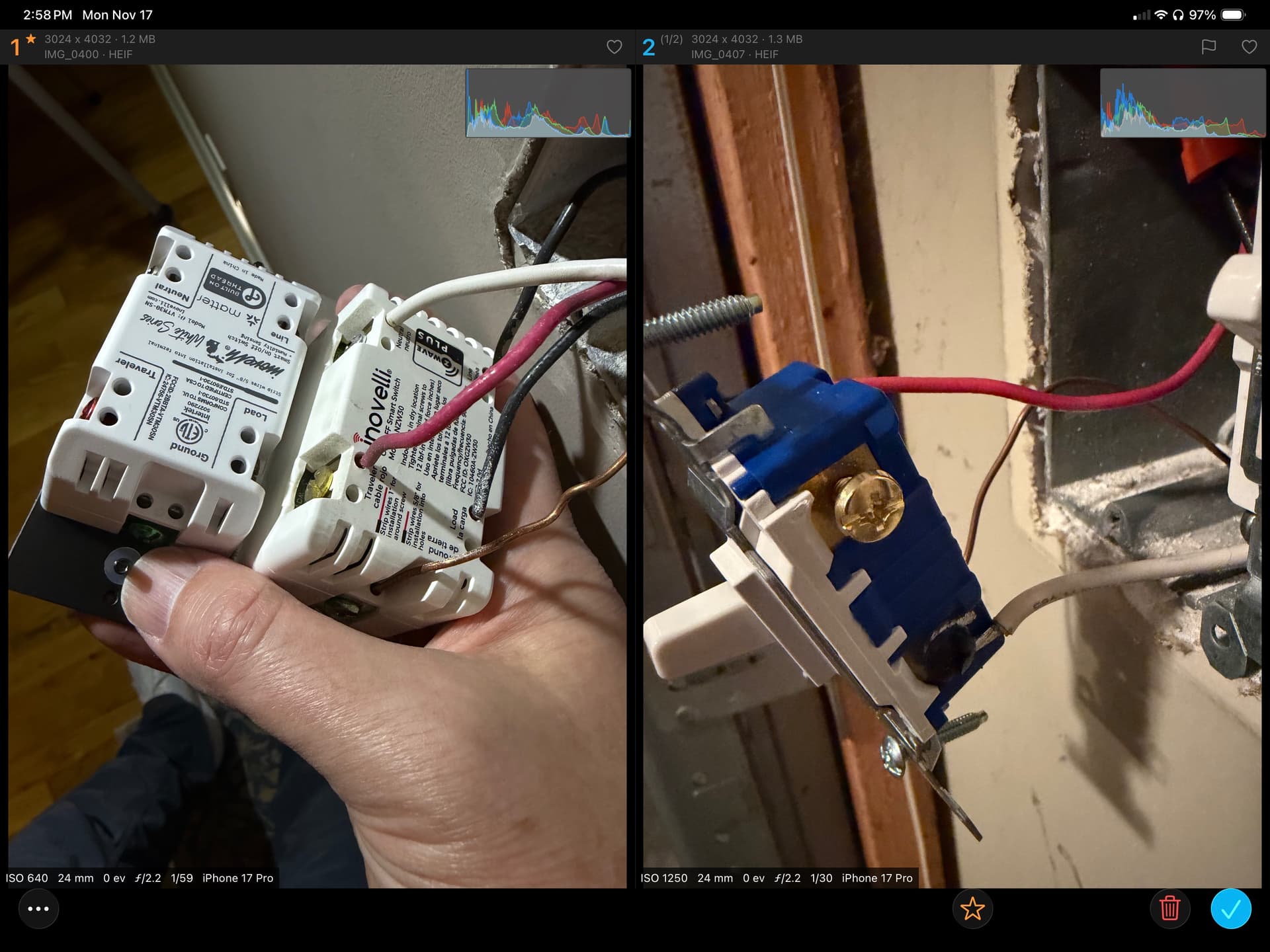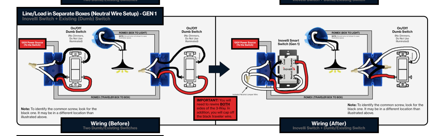 The photos are ones I took while initially installing yesterday, and do not show all of the box wiring. However, it shows the Inovelli swithces side by side to show where I just replaced it. In the dumb switch photo, the black traveller is connected to the load wire by a wire nut.